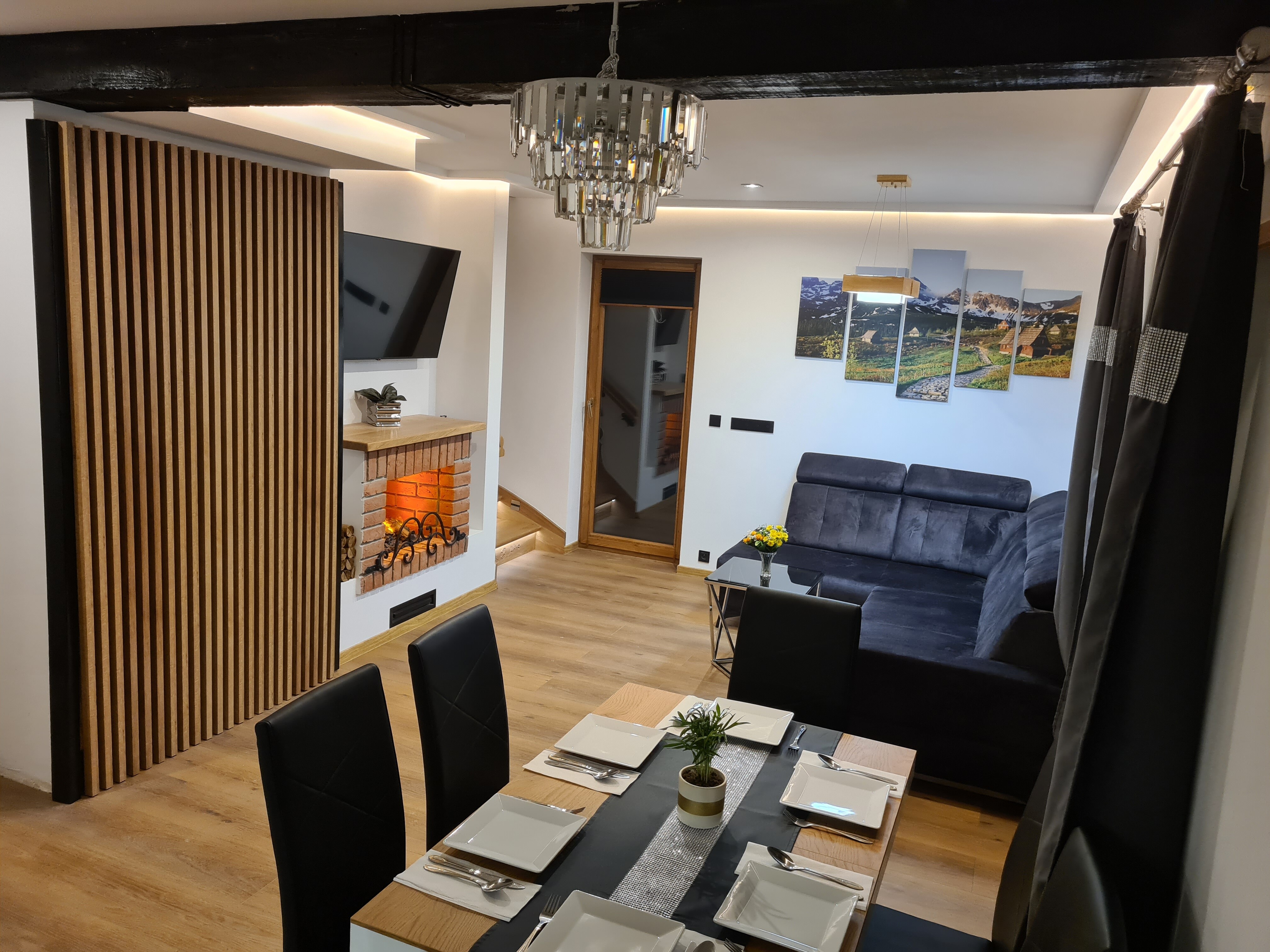 Przestrzenne pomieszczenia oraz bogate wyposażenie wnętrza w domku. Piękny widok na Giewont oraz Gubałówkę